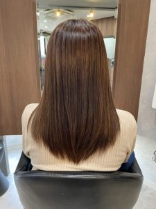 薬剤の選定から塗布の仕方まで細部にこだわり、約1時間半ほどで施術が完了。ダメージを最小限に抑えながら、秋のファッションにも映える、落ち着いた色味を実現しました。