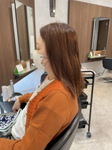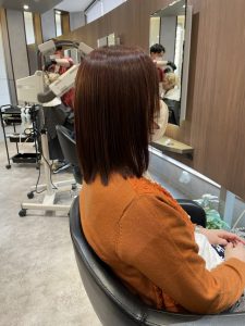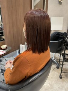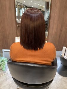 仕上がりは、まさに「期待以上」の仕上がりとなりました。お客様にも「いつも以上にツヤが出て、まとまりも良くなった」と喜んでいただくことができました。 レッド系カラー特有の深みと鮮やかさがありつつ、白髪がしっかりカバーされているため、自然でおしゃれな印象へと変化しています。さらに、クセによる広がりやパサつきが抑えられて、指通りもスムーズ。毎朝のスタイリングが楽になったとおっしゃっていました。 このような変化は、美容師としても大変嬉しいことです。