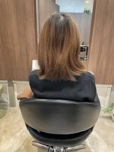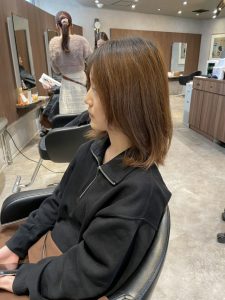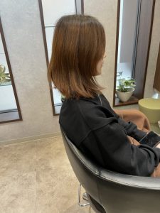 前回のご来店時に、ロングからミディアムまでしっかり長さを切っていましたが、そこから約2ヶ月経ち、さらに短くしたいというご希望でご来店くださいました。